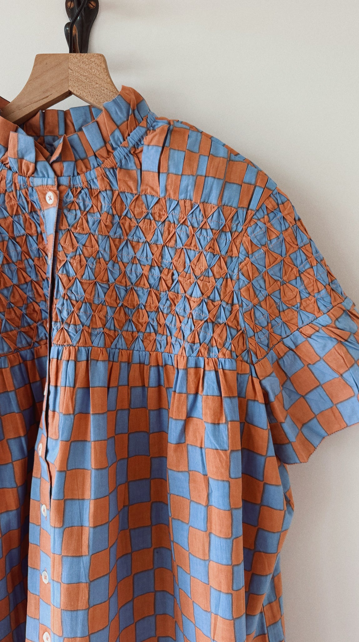 Our signature diamond smocked blouse with button closure and ruffle collar.