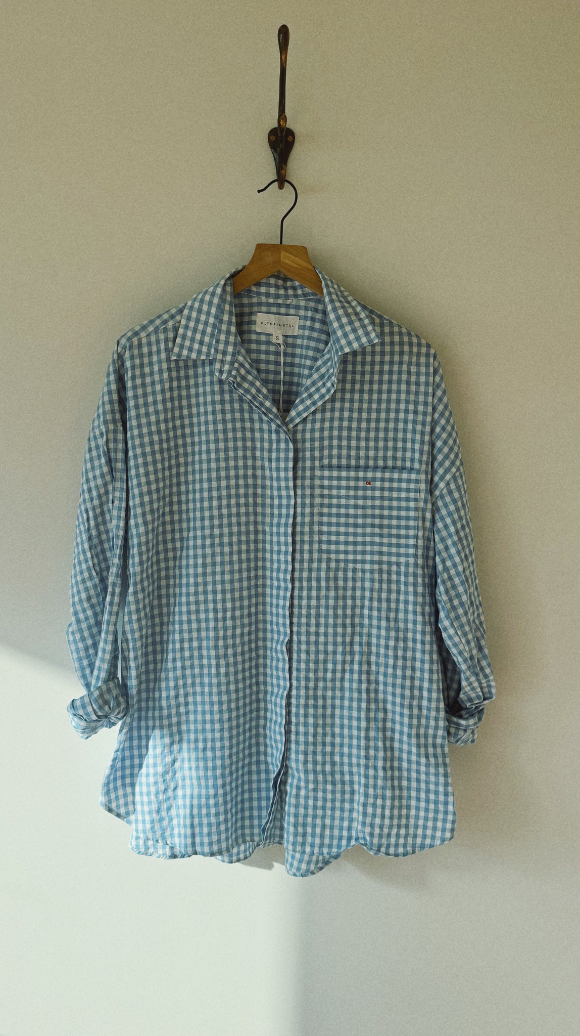 Oversized mens style button down — our must have wardrobe essential. Cotton gingham gives texture and a crisp tailored look. O.E embroidery pocket detail. Only offered in size small (one size fits most)