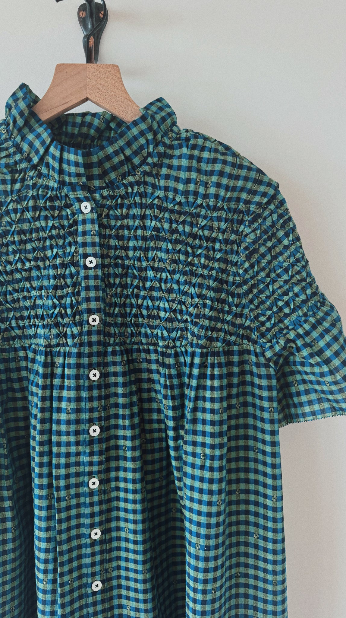 Our signature diamond smocked blouse with button closure and ruffle collar.